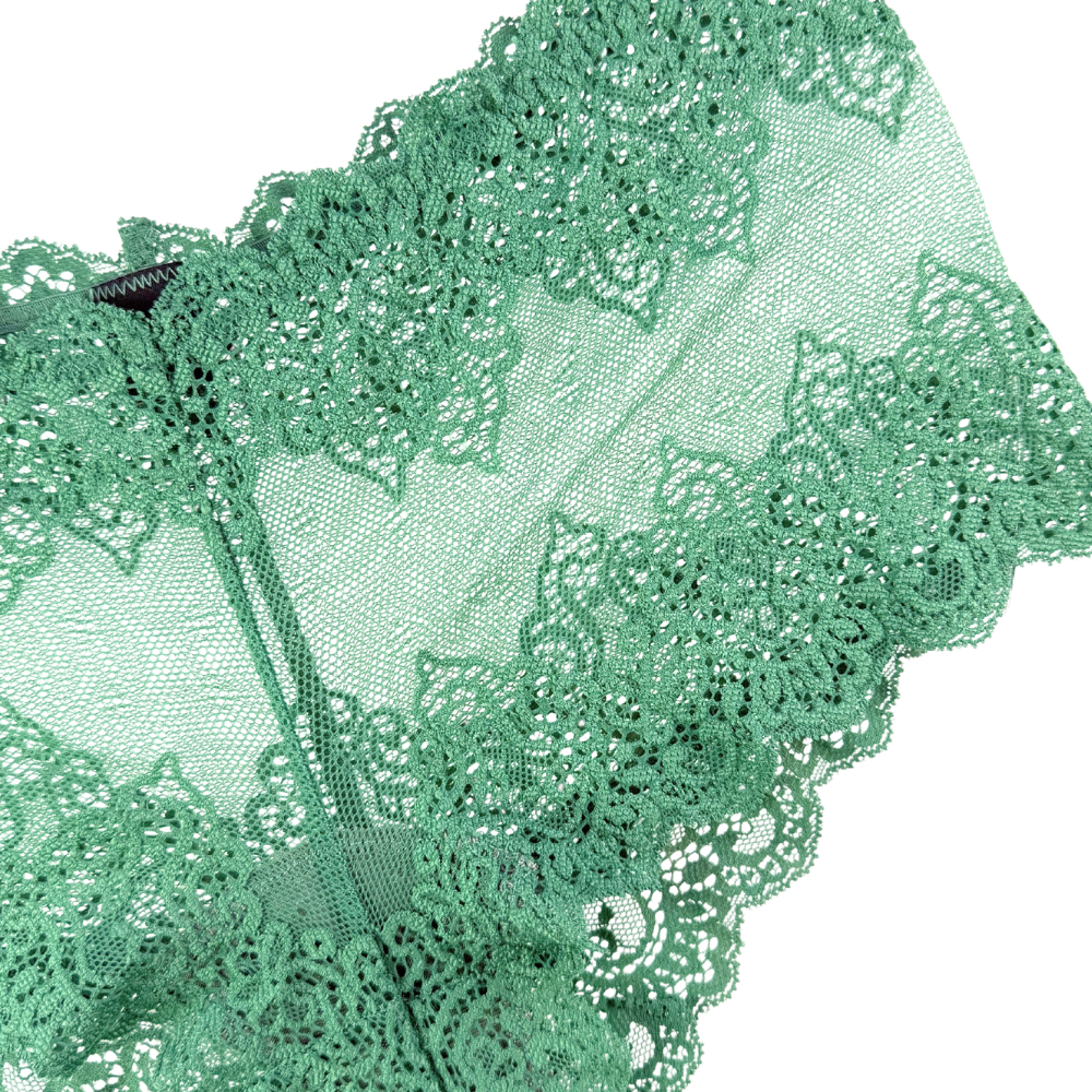 • Cheeky, see-through lace back coverage.